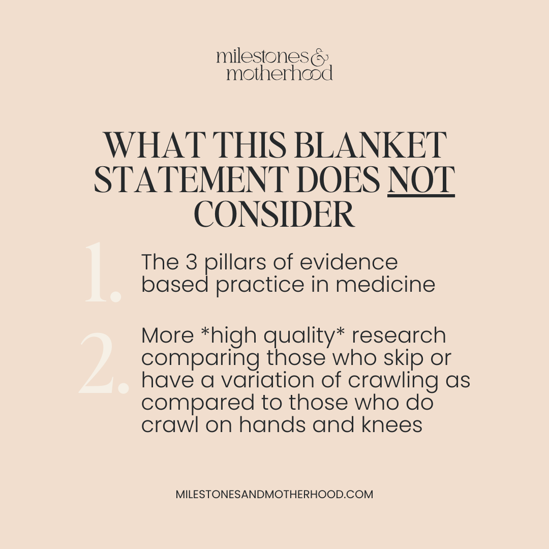 In my opinion, aside from the fact it’s inaccurate, there are TWO really important things a blanket statement like ‘there is no research that crawling is beneficial or necessary for development’ does not at all consider.
