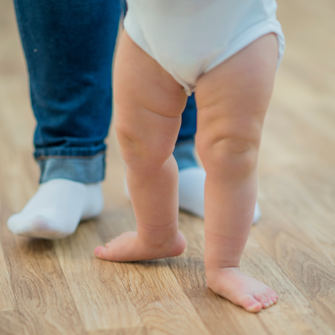 Overall…..both in and out-toeing are not typically a major concern, especially in the first 3-4 months after walking begins, even extending into the first few years of life! Much of resolving those leg positions just come down to development, how our musculoskeletal system changes & grows, and strengthening all of those big important muscles as they learn to roll, sit, crawl & walk!