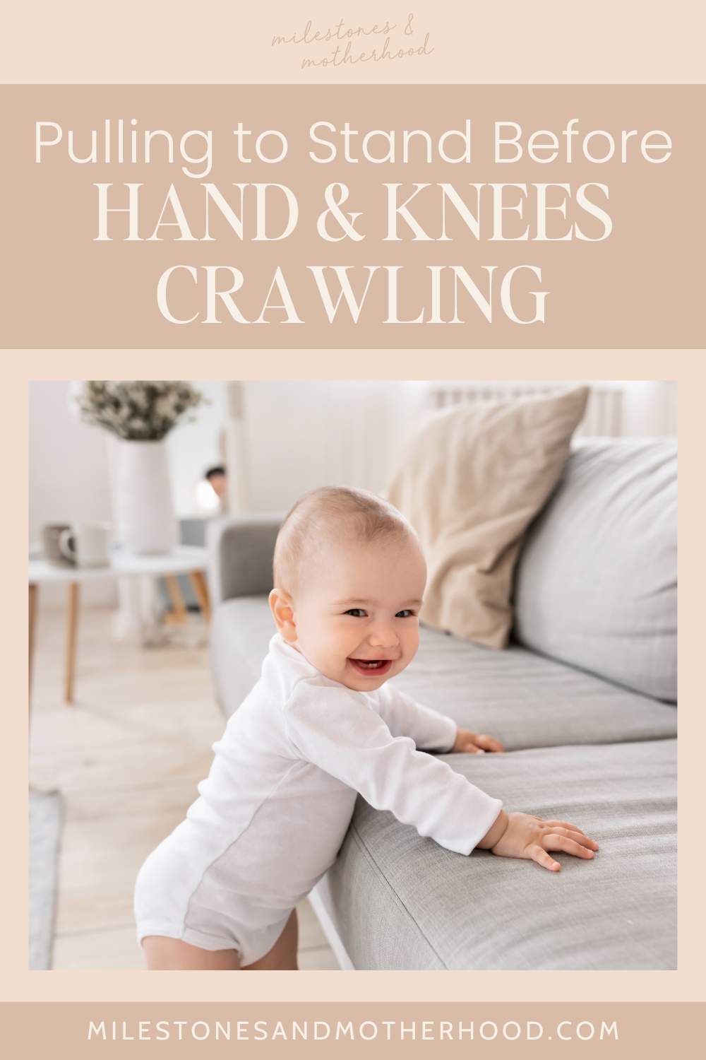 Also, hands and knees crawling and pulling to stand often happen almost simultaneously! Mostly because they are stronger. As they become more mobile independently, they can explore their environment more, which leads to attempts at pulling to stand!