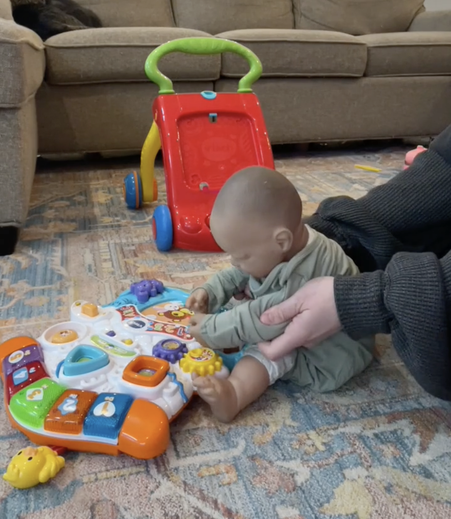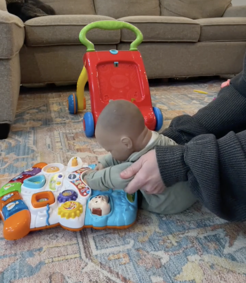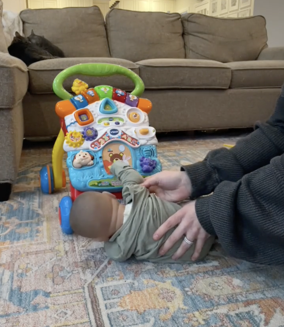 IF you’re waiting until closer to the pre-walking stage, I usually recommend just leaving the push walker within their play space if it’s safe to do so, giving them the opportunity to explore using it on their own as they play! Again, as mentioned earlier, letting your child lead is definitely the goal when it comes to push walkers!