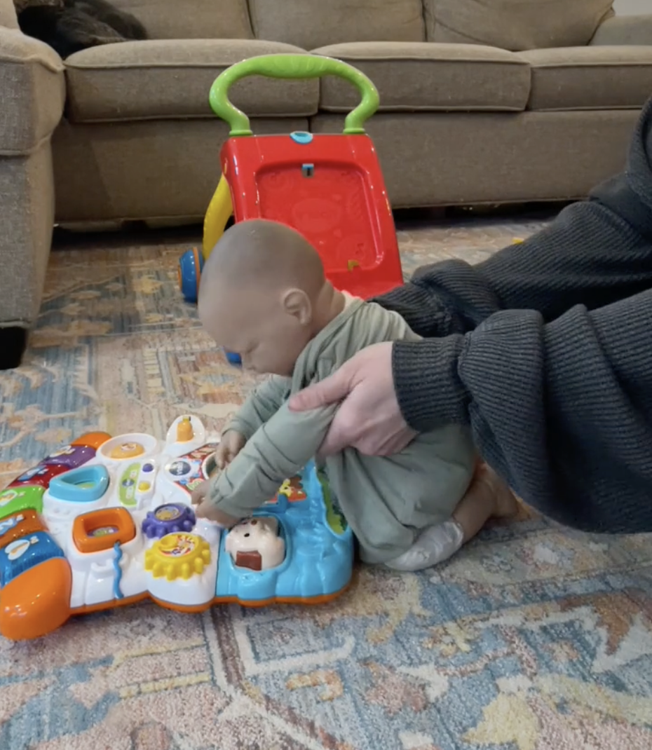 Again, while I find push walkers can be a really great option for helping support stability and confidence in upright exploration and pre-walking skills, some children definitely can get a bit reliant on them for support and may be unwilling to explore without them, which is when I usually say to consider just putting it out of sight for a bit! The biggest indicators that a child may be relying on it too much would be a stall in progress of their upright skills and/or them NOT being willing to explore upright WITHOUT it or without other supports (like your hands). What I mean about progress in upright skills is that generally speaking, we want to see a child moving “forward” with skills, aka making progress – even if that progress is ‘slow and steady’.