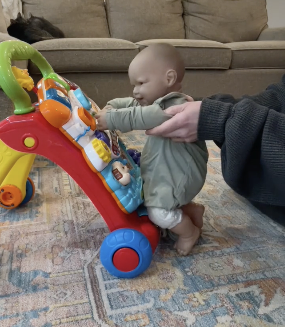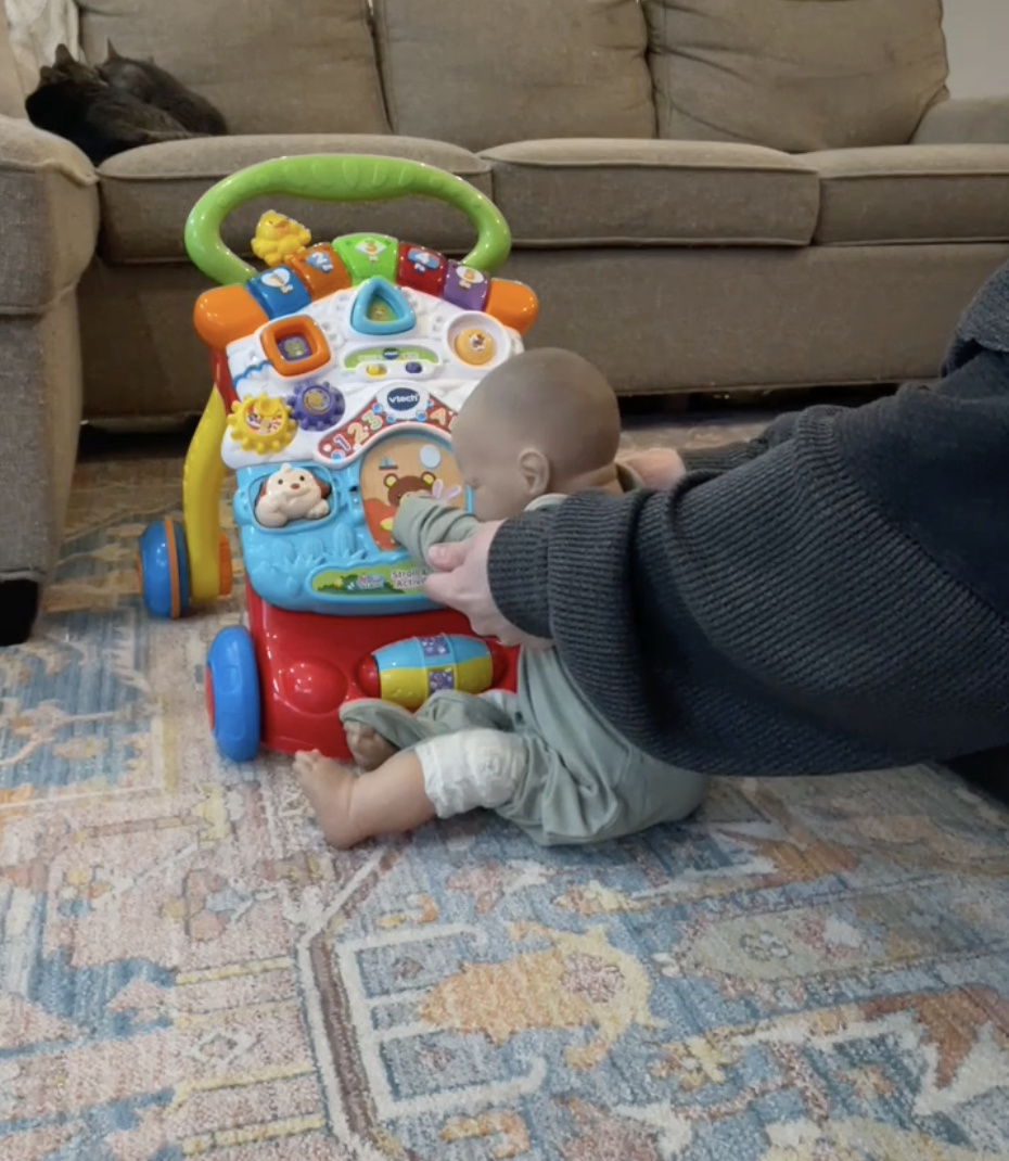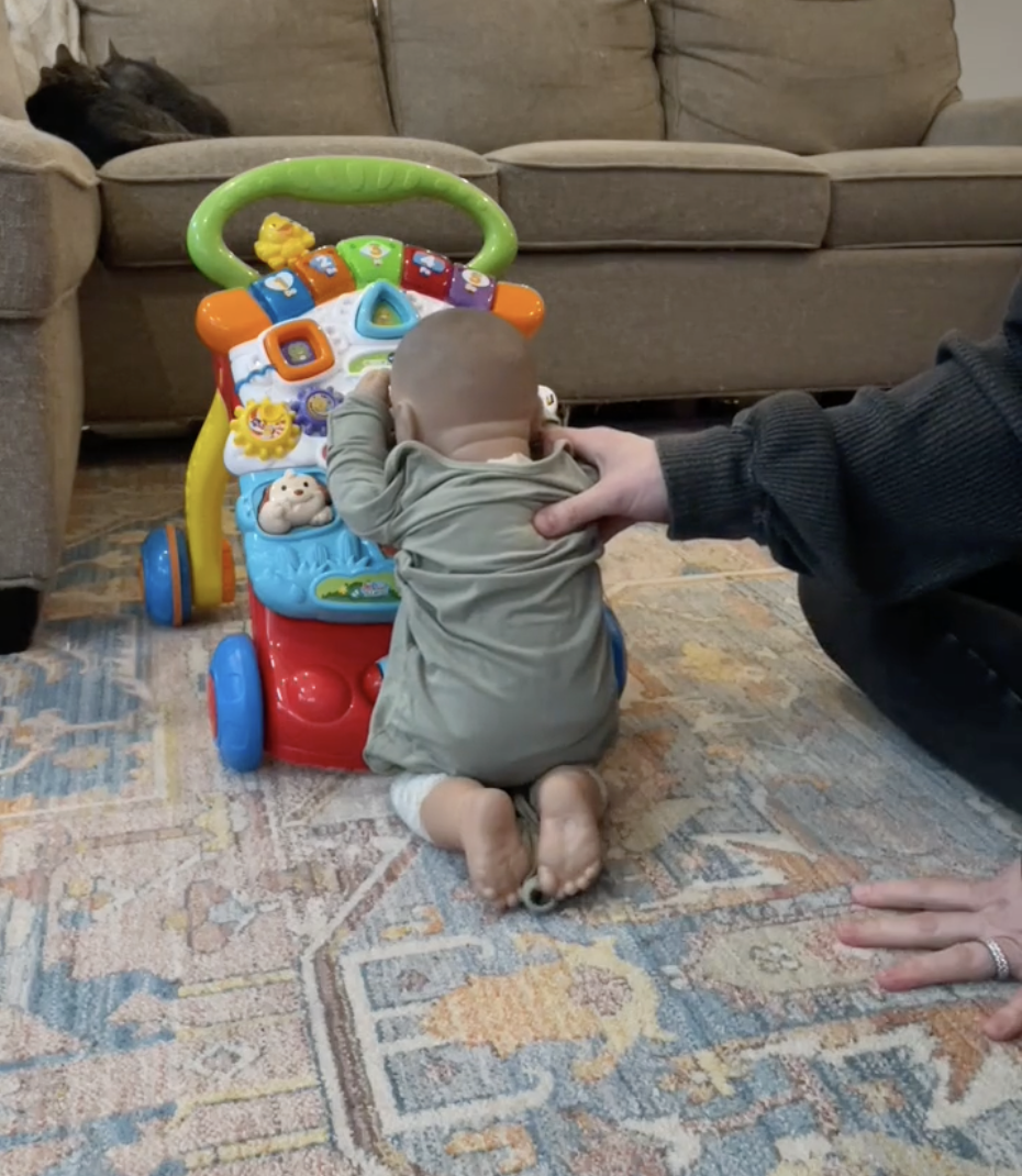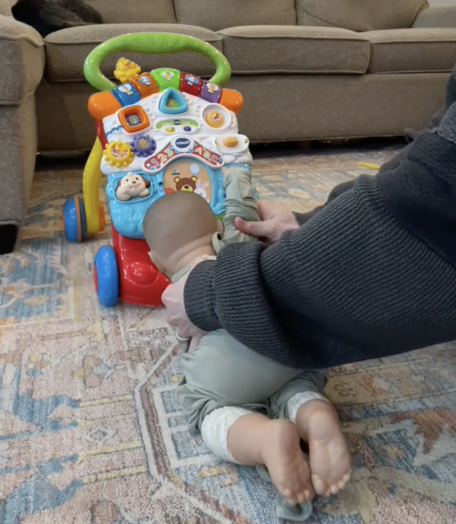 TIP: As I mentioned above, push walkers can topple over when they’re pulling to stand, or move too quickly for them to keep up with, especially on certain floor surfaces (ie: carpet vs. tile or wood). If you’re noticing either of those, giving a little weight to the front of the push walker can make a huge difference! For a visual of how to do this, check out my reel on Instagram here
