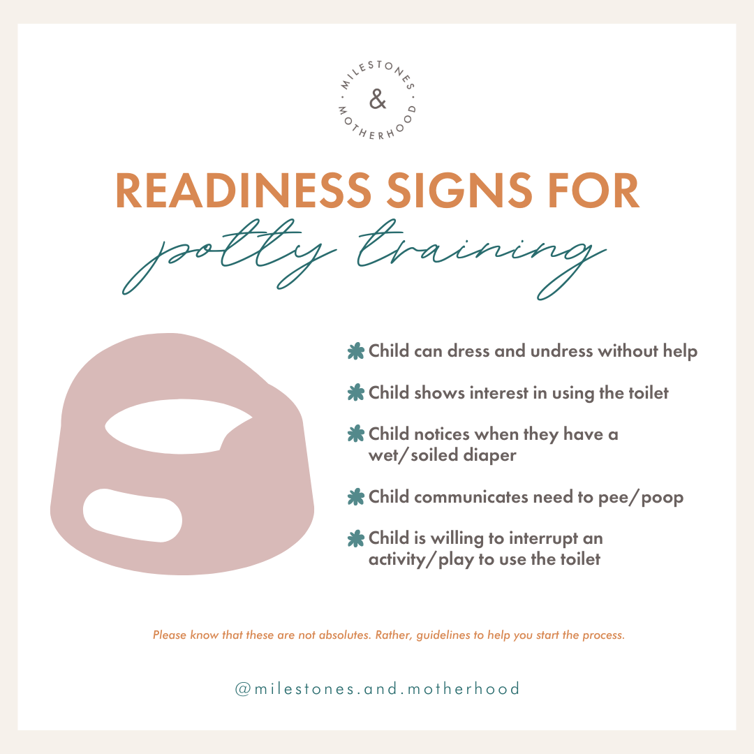Below you will find the readiness signs for starting potty training! Please know that these are not absolutes. Rather, guidelines to help you start the process.