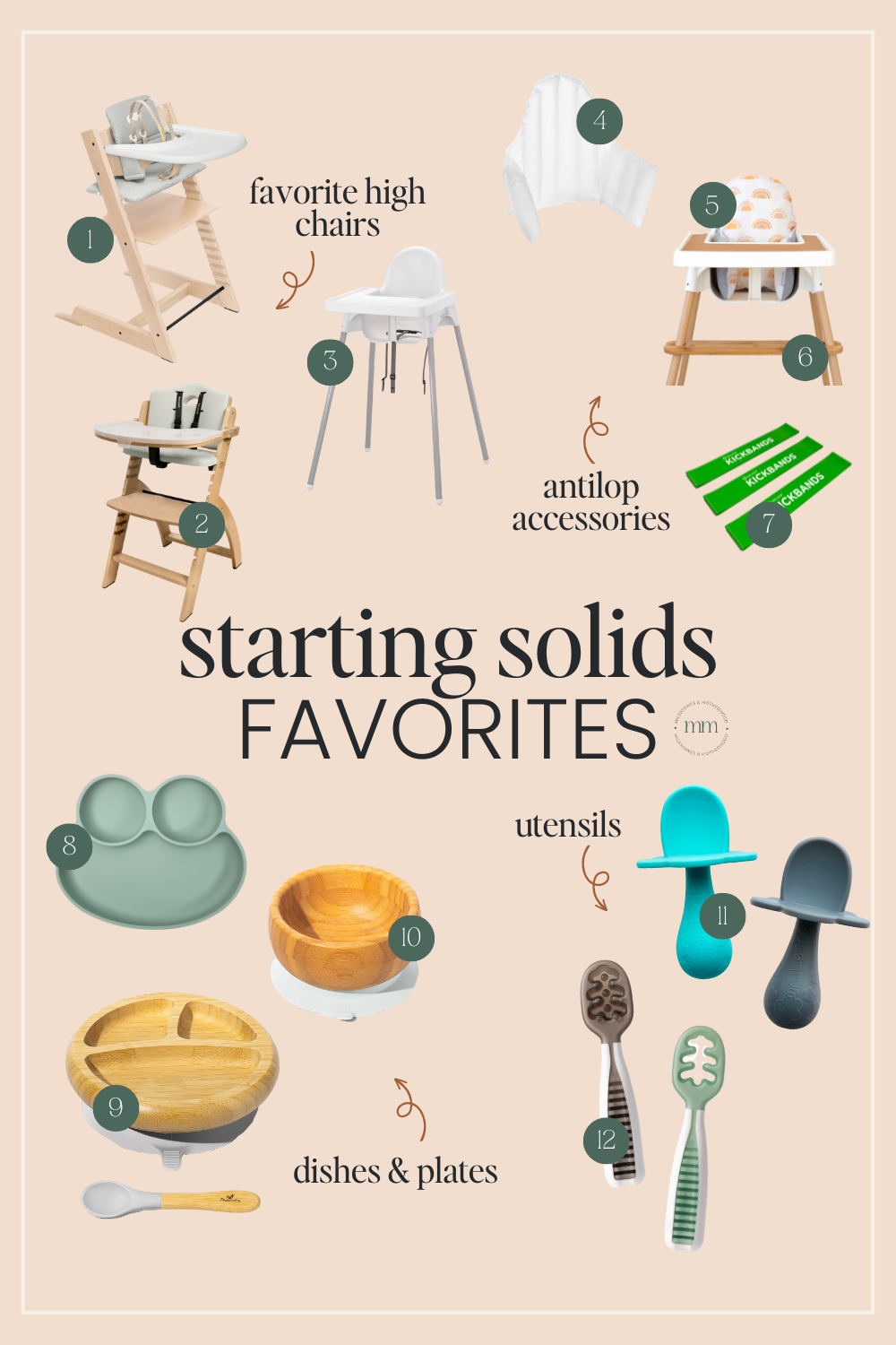 1. Stokke Tripp Trapp High Chair | 2. Abiie Convertible High Chair | 3. Ikea Antilop High Chair | 4. Cushion Insert (Amazon | Yeah Baby Goods) | 5. Yeah Baby Goods Cover (Discount Code: milestonesandmotherhood15) | 6. Yeah Baby Goods Highchair Footrest (Discount Code: milestonesandmotherhood15) | 7. Kick Bands (for a DIY footrest) | 8. Abiie Silicone Plate | 9. Avancy Bamboo Divided Plate | 10. Avancy Bamboo Bowl | 11. Grabease Silicone Spoons | 12. Numnum Pre-spoon Set