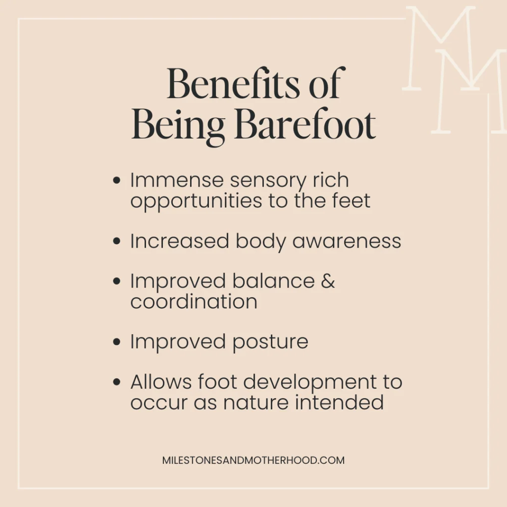 For more on the benefits of barefoot, including some of my favorite Barefoot Shoes (for adults & littles!), check out the Milestones & Motherhood Shoe Guide!