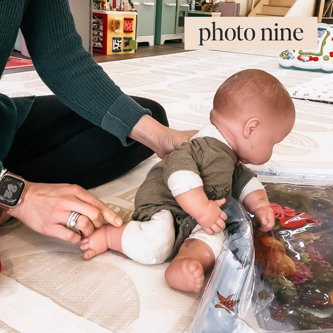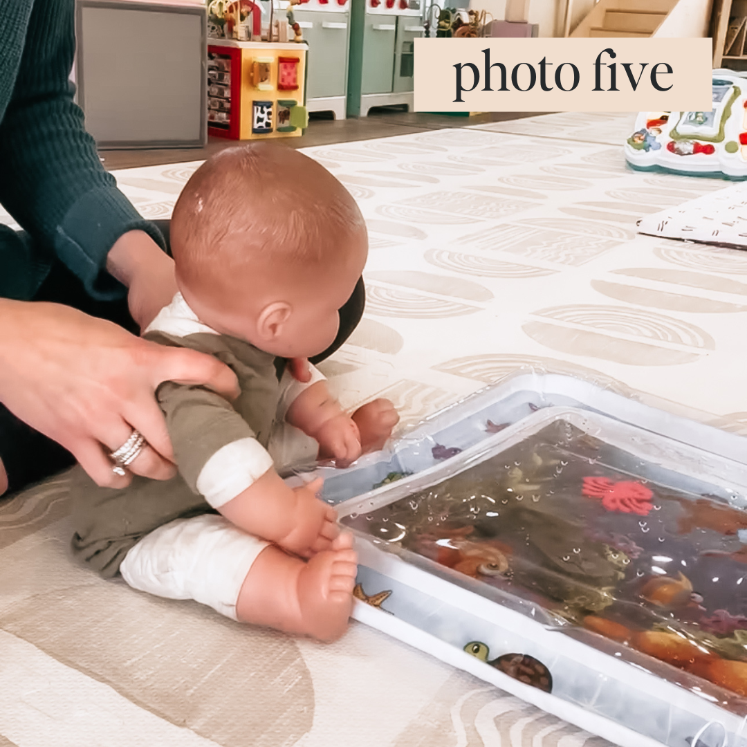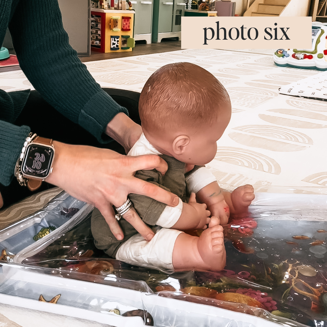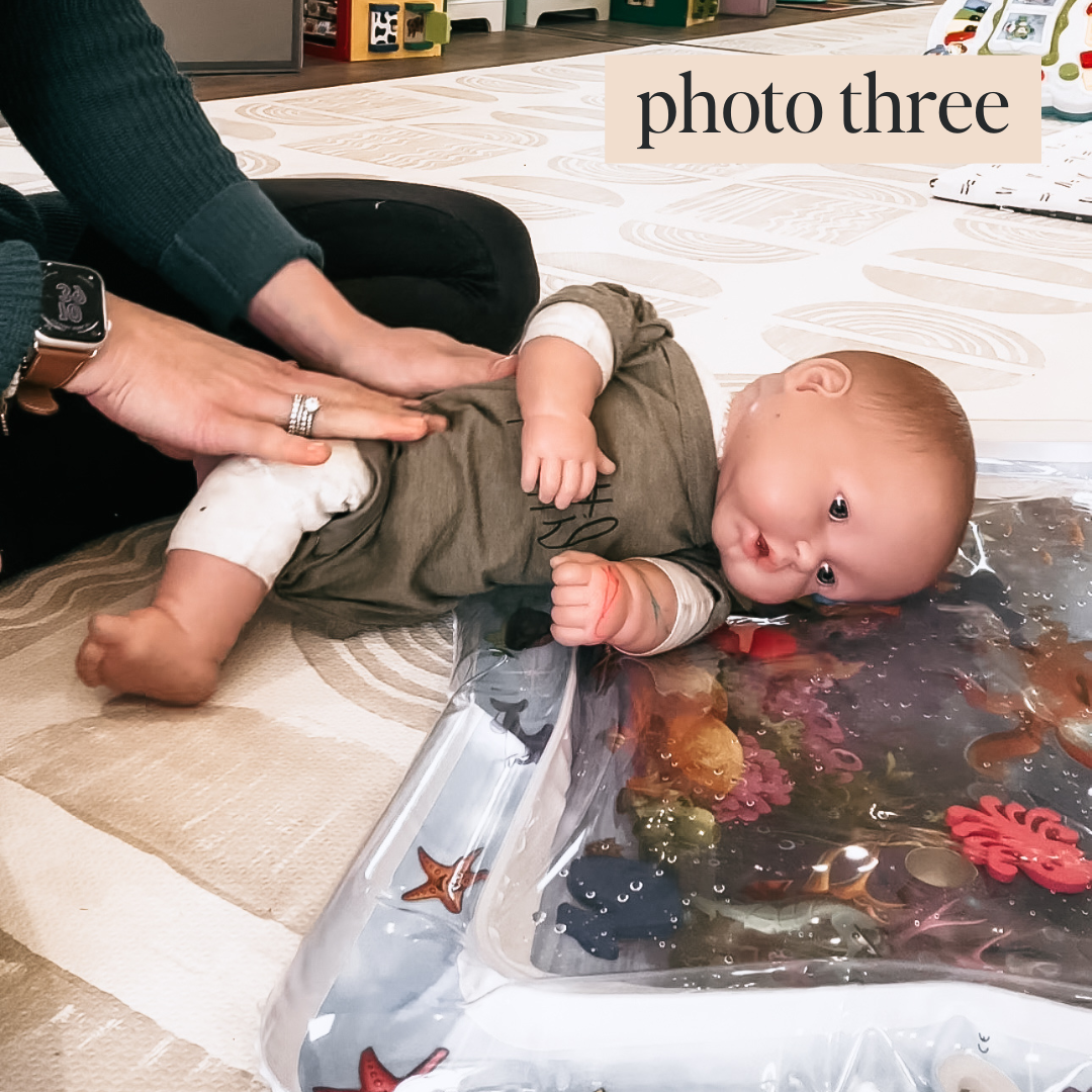 To encourage weight shifting during water mat use, check out photo two – the magic happens here because unlike regular floor mats, water mats aren’t just stationary. Instead, as they move, the water moves as well, redistributing their weight and helping create natural shifting. Add in some intentional toy placement to encourage them to lift one hand & reach, and you can ramp that up even more! To check out a full list of LOTS of my favorite toys for tummy time that are not only FUN, but developmentally friendly, click here!