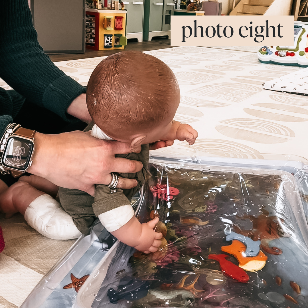 For pre-crawling water mat play, you can begin with them on hands on knees [photo seven] on top of it OR with just their hands on it. This gives them the opportunity to strengthen hips, shoulders & core, the 3 big muscle groups that have to be both strong AND coordinated in order to crawl on hands and knees.