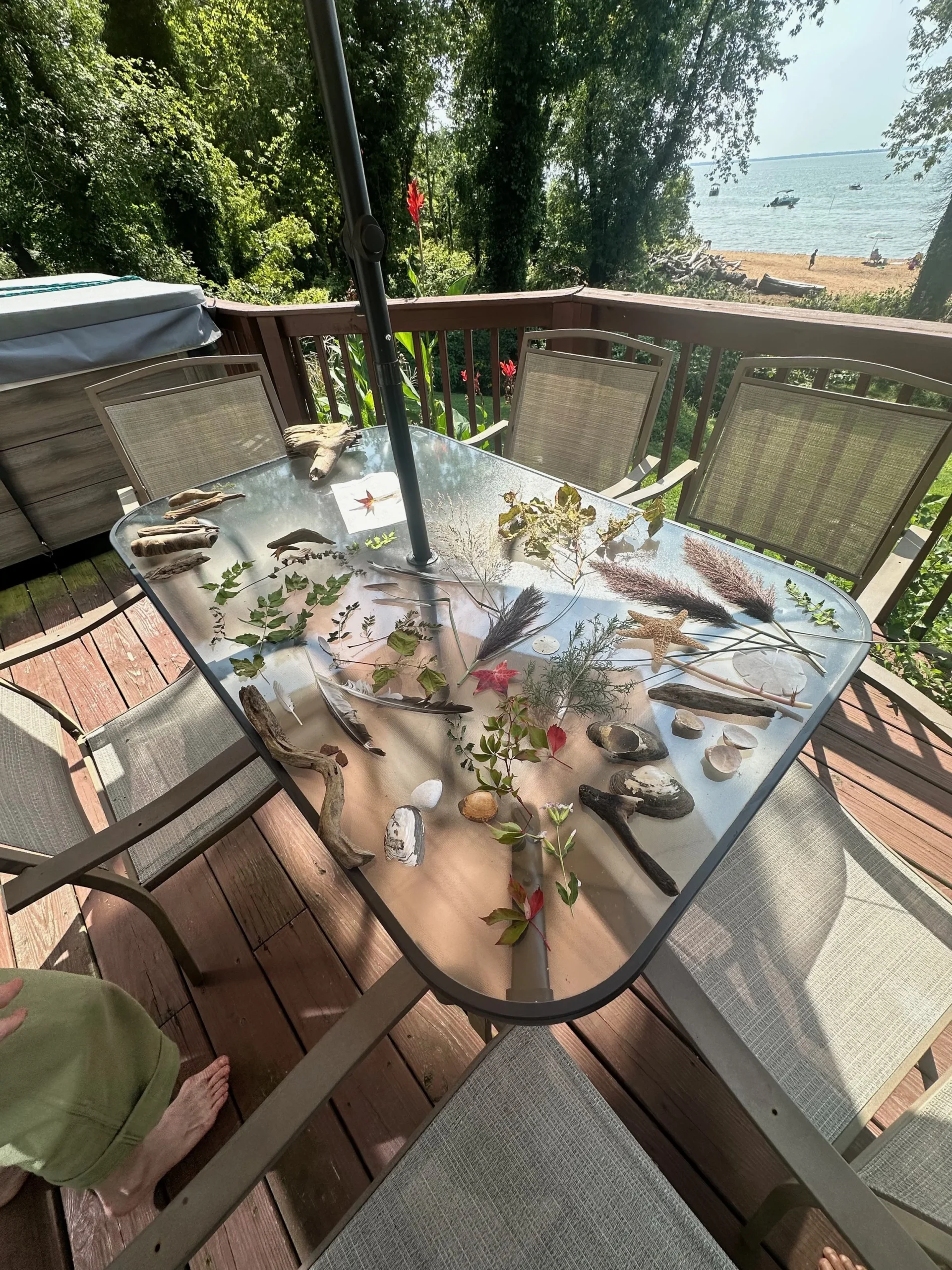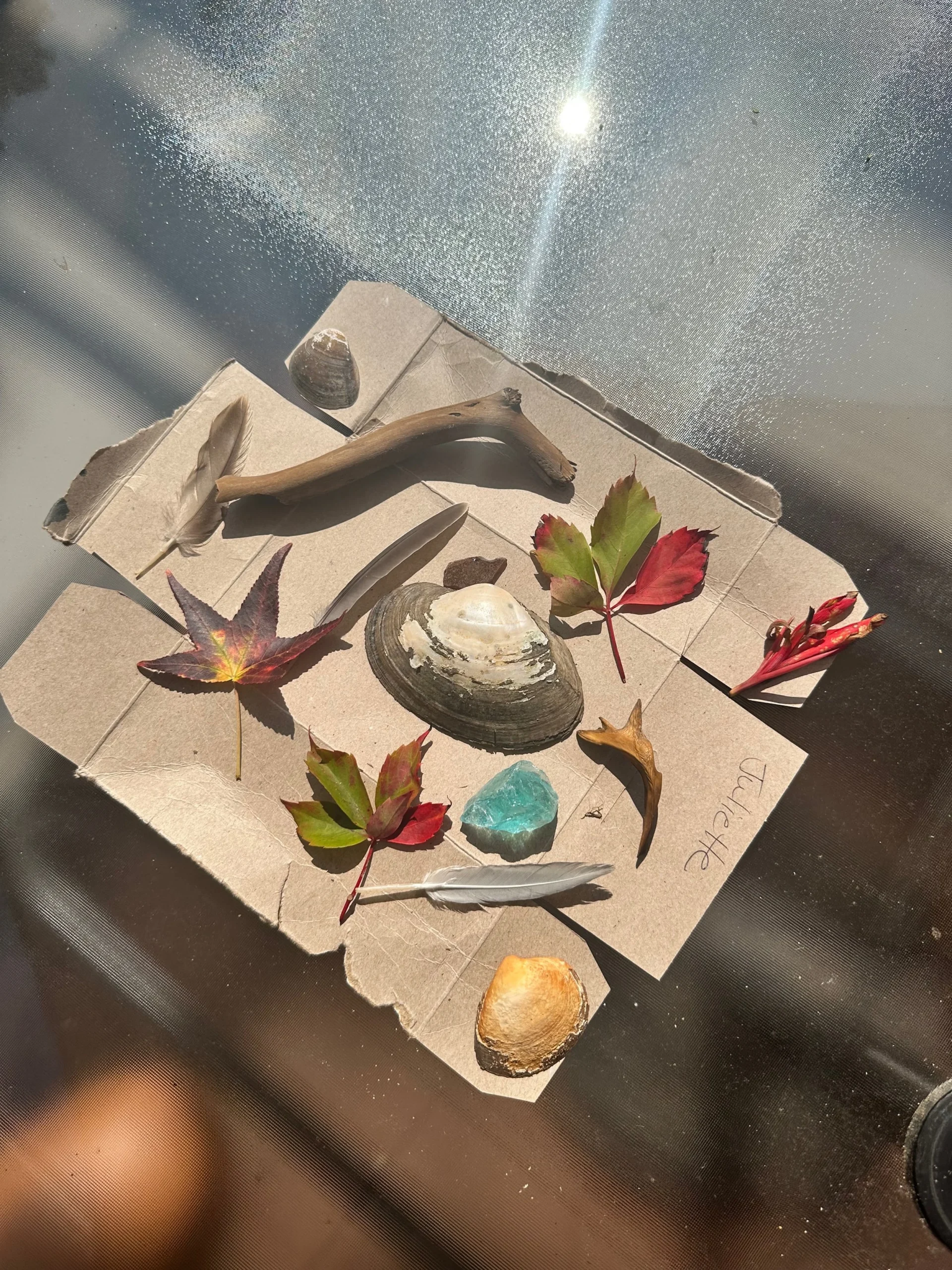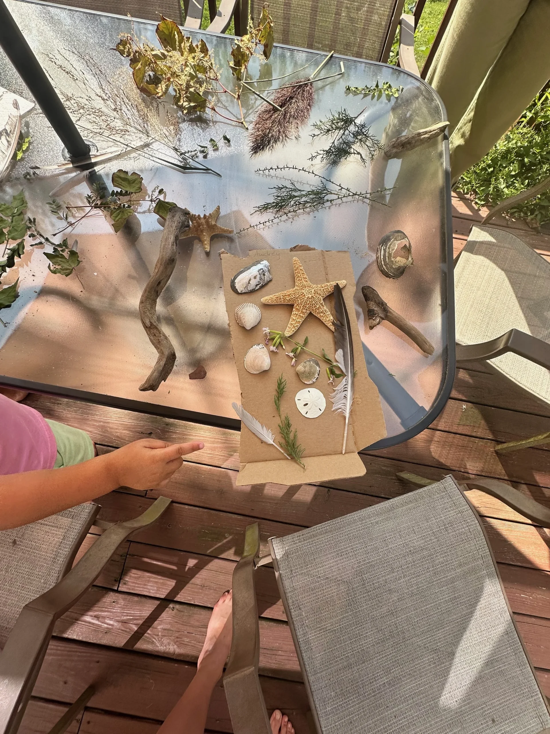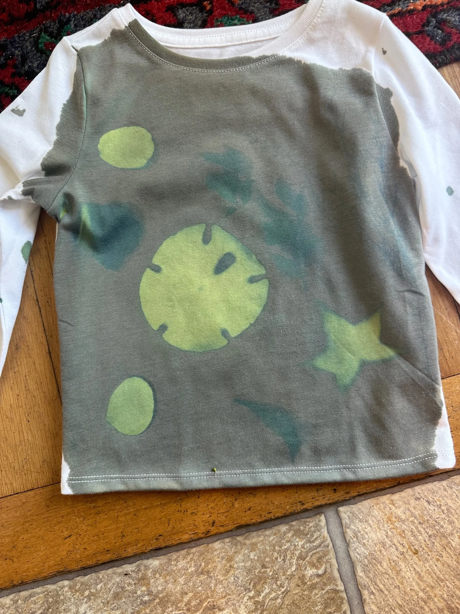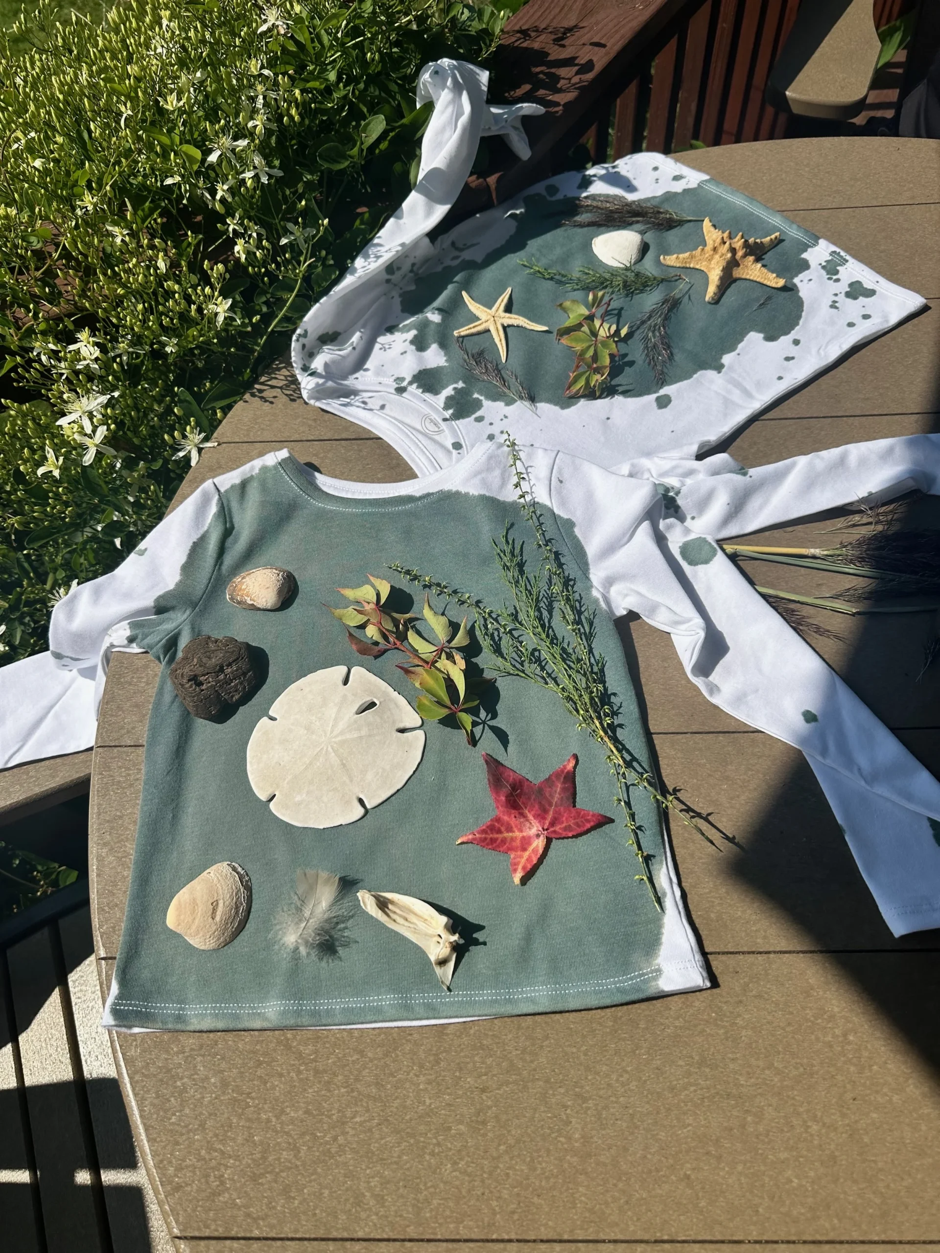 Once the design is laid out, you expose the shirt to full sun WITH the items on it, leaving it there for anywhere between 5-30 minutes, depending on a few factors (like time of day/direct sun, how defined you’re looking for the design to be, etc).