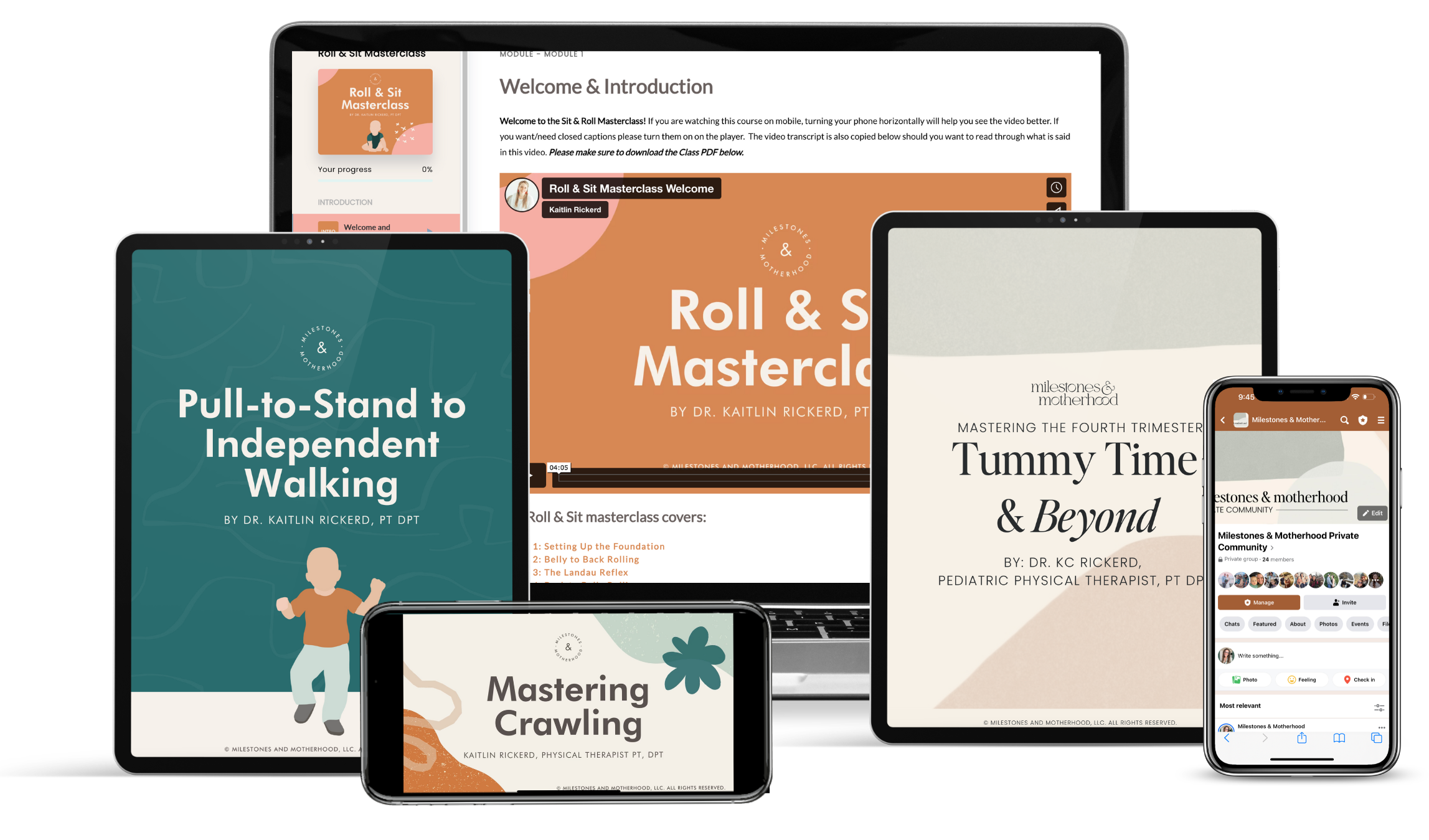 For developmental questions, tips and guidance related to milestones about tummy time, rolling & sitting, crawling and walking, check out KC’s developmental Masterclasses linked here.