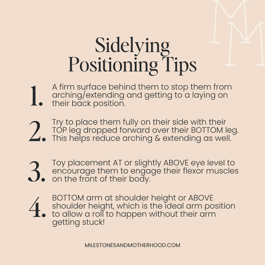 When it comes to rolling, one of my favorite things to do during this emerging period to encourage both sides equally is to pull in some sidelying play with intentional toy placement upwards & on a diagonal (see pic for reference!).