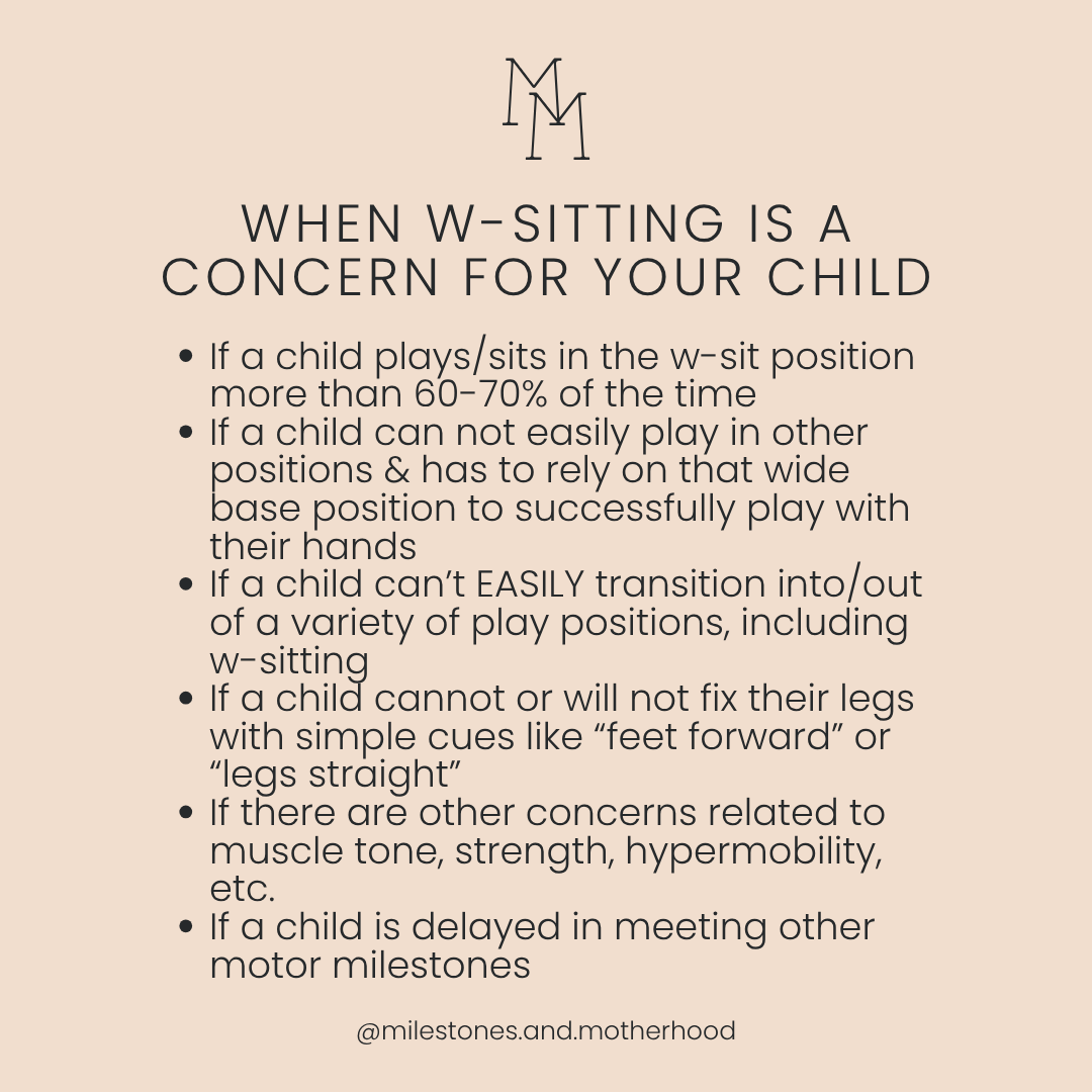 W-sitting can be and often is simply one of many play positions a child will move through while engaging and exploring their environment, especially for children that are crawling and in general, for children under the age of 5. However, if it is the primary or only way a child can successfully play using their hands while on the floor, it warrants a closer look.