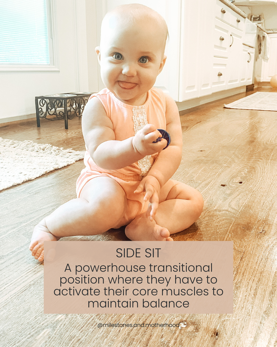 When you start to see your child doing a side/z-sit, not only are they gearing up to learn how to transition from sitting <> the floor, they’re also very likely being close to learning to crawl, which is a HUGE developmental goal. More on the why crawling is the most important milestone can be found here!